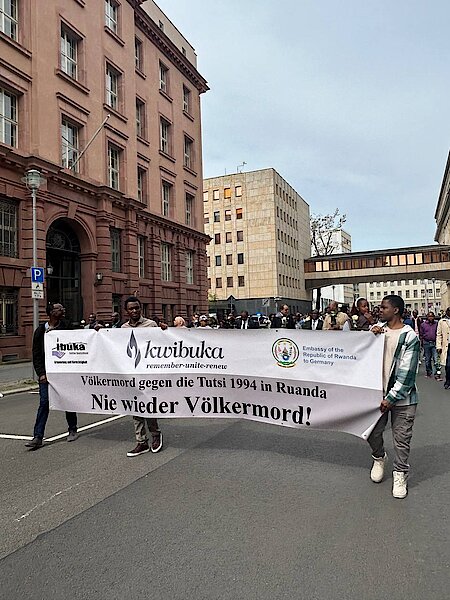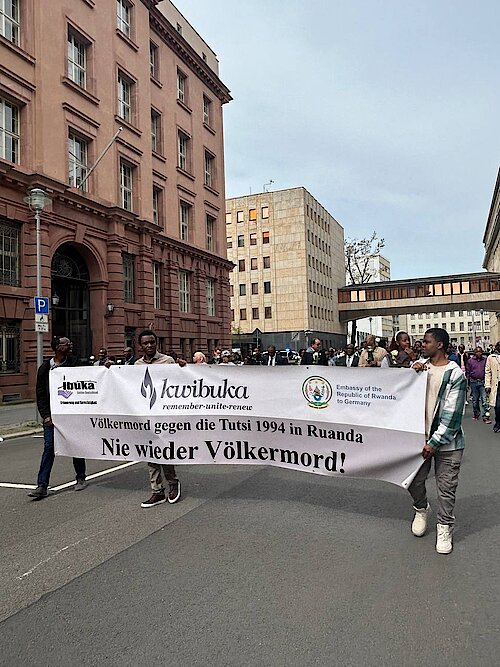 After the Walk of Remembrance, members of the Rwandan community gathered at the Thuringian State Representation building, where candle flames were lit from person to person to mourn the massacre of nearly a million people in Rwanda. Members of the Rwandan Community in Germany walked along Berlin’s city centre holding banners depicting messages such as “Genocide, never again.”