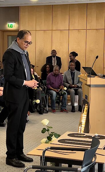 Ambassador Igor CESAR lit the first candle, followed by Ibuka Germany representative Judence Kayitesi, who opened the floor to a number of witnesses and Genocide survivors such as Meusien Valens Kabarari, author of the book "Living", who told his personal story of surviving the massacre next to his late family members. He presented the documentary "Vivant les Chémins de la Mémoire", with soundtrack by artist Jules Sentore.