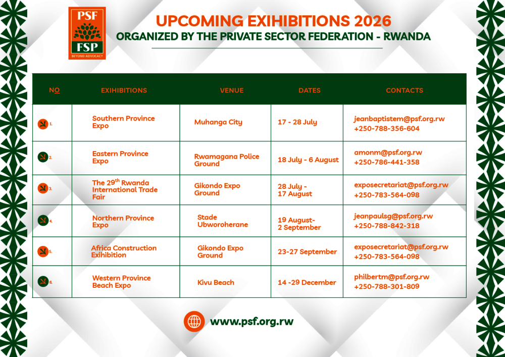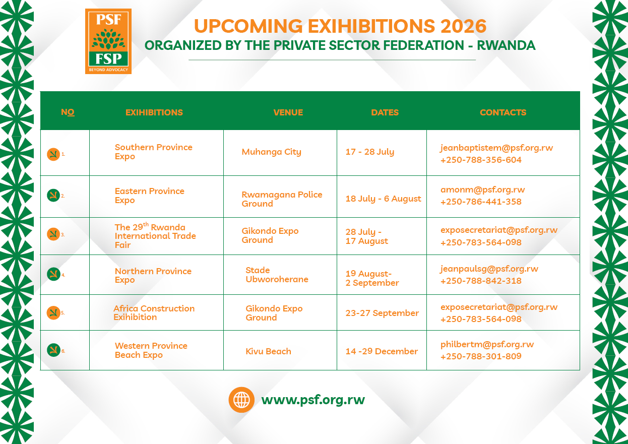 Rwanda continues to strengthen its position as a regional hub for business and investment through a series of major exhibitions organized by the Private Sector Federation (PSF) in partnership with the Ministry of Trade and Industry (MINICOM).